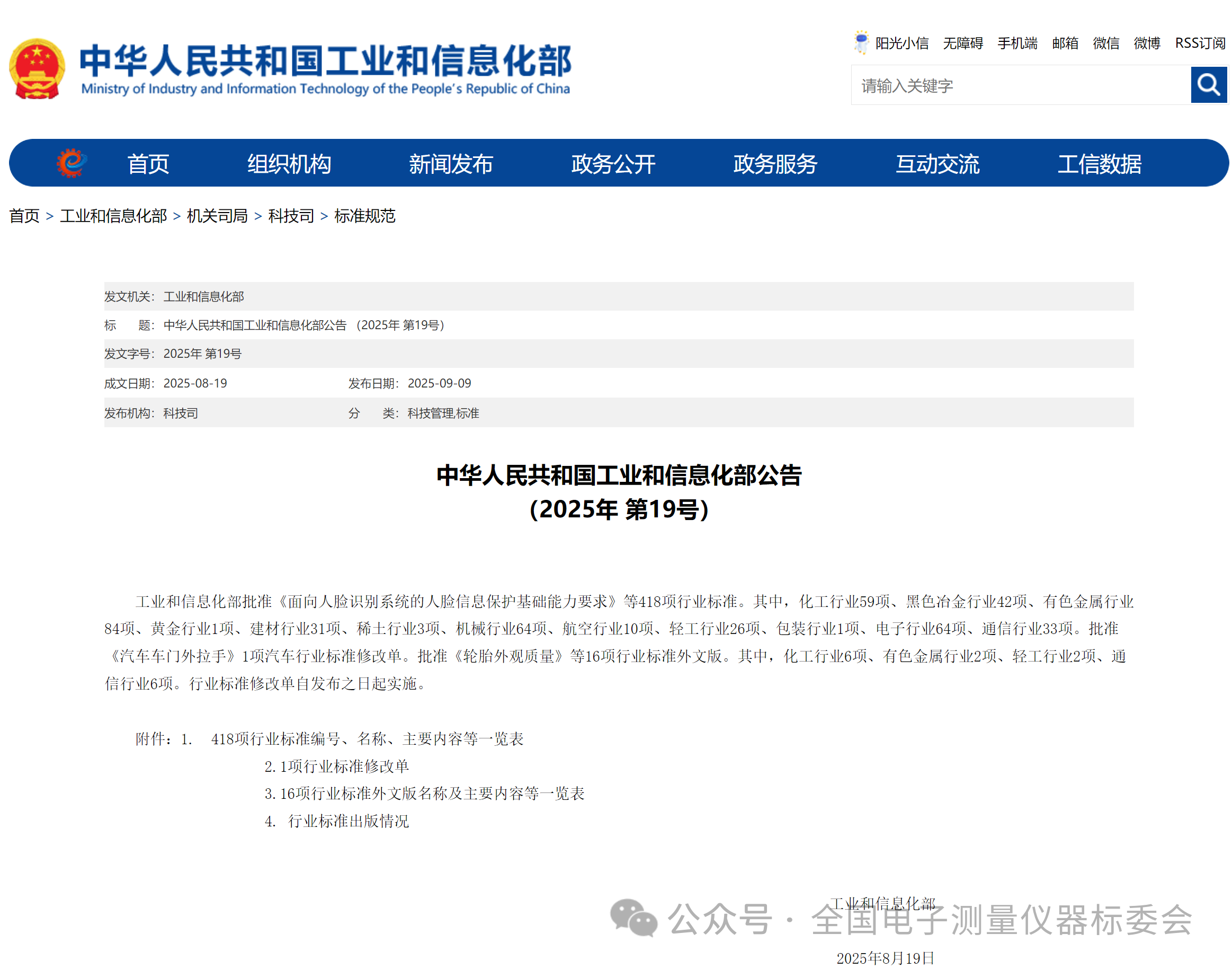 根據中華人民共和國工業和信息化部公告(2025年 第19號),由全國電子測量儀器標準化技術委員會歸口的《鋰電池芯短路測試儀》(標準號:SJ/T 10230-2025)《電子紅外額溫計通用規范》(標準號:SJ/T 10231-2025)等2項電子行業標準正式發布。